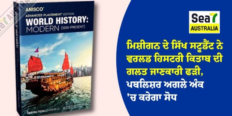 ਮਿਸ਼ੀਗਨ ਦੇ ਸਿੱਖ ਸਟੂਡੈਂਟ ਨੇ ਵਰਲਡ ਹਿਸਟਰੀ ਕਿਤਾਬ ਦੀ ਗਲਤ ਜਾਣਕਾਰੀ ਫੜੀ, ਪਬਲਿਸ਼ਰ ਅਗਲੇ ਅੰਕ ‘ਚ ਕਰੇਗਾ ਸੋਧ